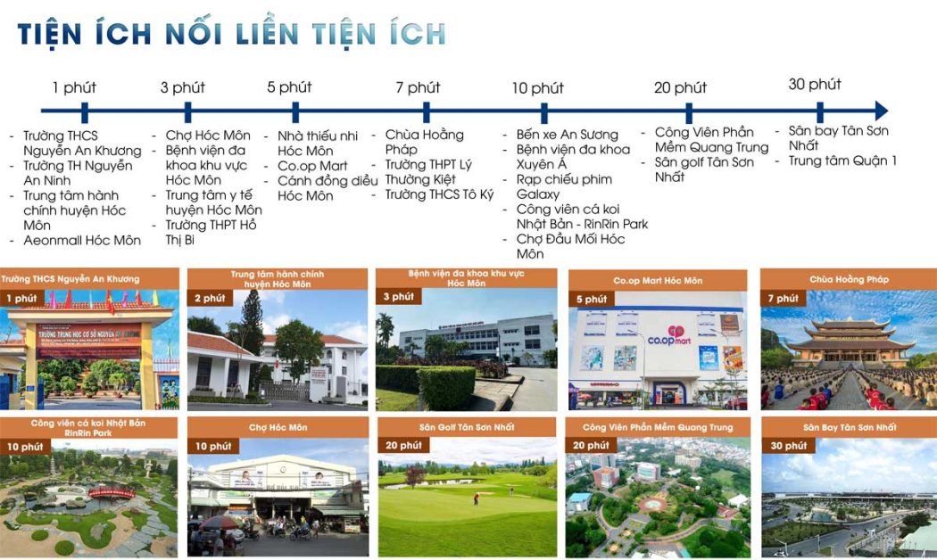 - 1 phút tới: Trường trung học cơ sở Ông An Khương – Trường TH Ông An Ninh – Trung tâm hành chính huyện Hóc Môn – Aeon Mall Hóc Môn