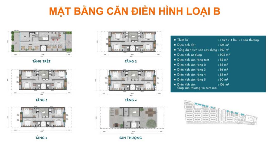 - Mẫu Căn giữa điển hình: diện tích đất 108m2, thiết kế gồm 1 trệt – 4 lầu -1 tầng thượng, tổng diện tích sàn 517.3m2