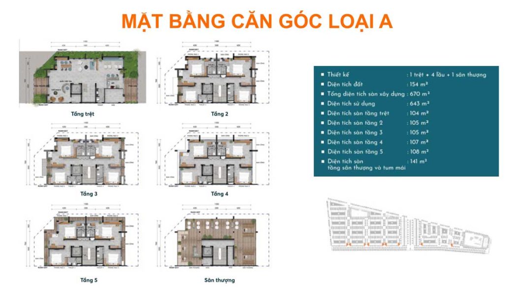 - Mẫu Căn góc điển hình: diện tích đất 154m2, thiết kế gồm 1 trệt – 4 lầu -1 tầng thượng, tổng diện tích sàn 669.5m2