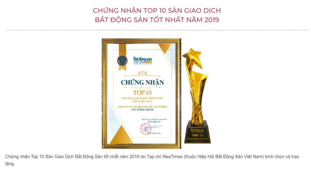 + Giải thưởng doanh nhân tiêu biểu xuất sắc năm 2017 (Ông Trần Quốc Việt – Chủ tịch HĐQT Kiêm Tổng giám đốc Công ty CP Tập đoàn Địa ốc Cát Tường).