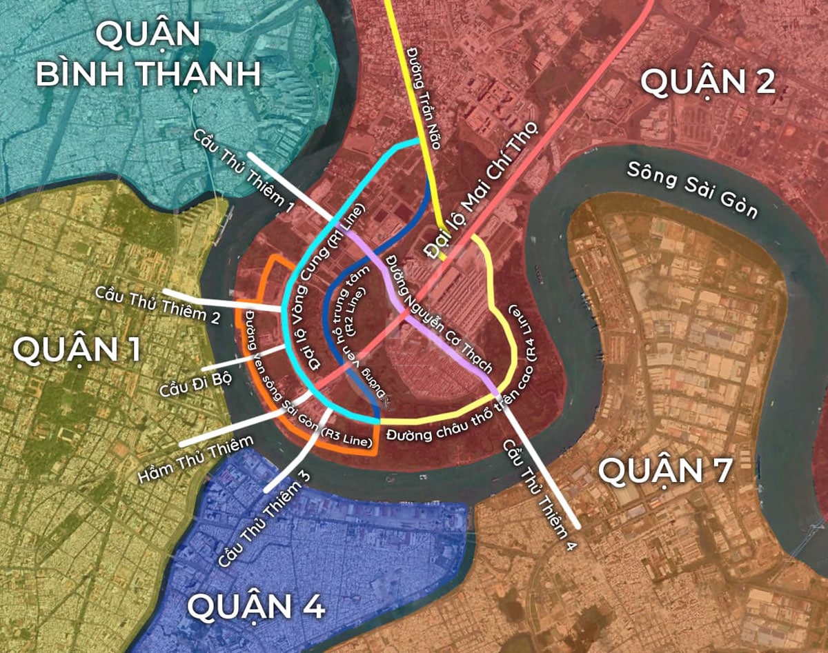 Theo quy hoạch phát triển, khu đô thị mới Thủ Thiêm có 5 cây cầu, hầm vượt sông kết nối tới các khu vực khác nhau của thành phố. Ngoài cầu Thủ Thiêm 1, hầm vượt sông Sài Gòn đã hoàn thành và đưa vào sử dụng, từ khu đô thị này còn có cầu Thủ Thiêm 2 nối Quận 1 với Quận 2 & Cầu Thủ Thiêm 3 nối quận 4 và cầu Thủ Thiêm 4 nối quận 7 và cầu đi bộ qua bến Bạch Đằng – quận 1. Hiện 3 dự án này vẫn đang trong quá trình quy hoạch.