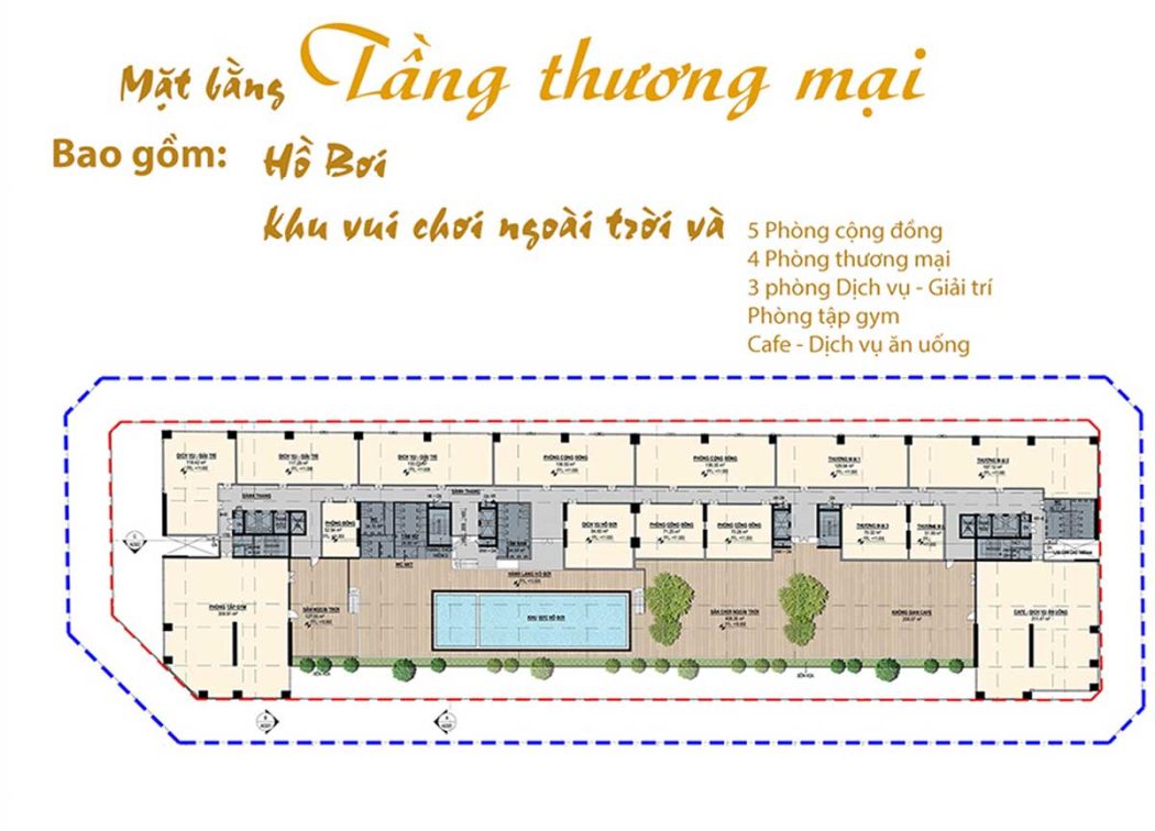Tại khu vực tầng lửng và tầng thượng, dự án được tích hợp các khu “đặc quyền” chỉ dành cho cư dân như hồ bơi, khu tắm nước mặn và nước ngọt, khu vui chơi giải trí trẻ em, người lớn, khu vực GYM, Spa, Yoga, công viên hồ nước bầu trũng,…