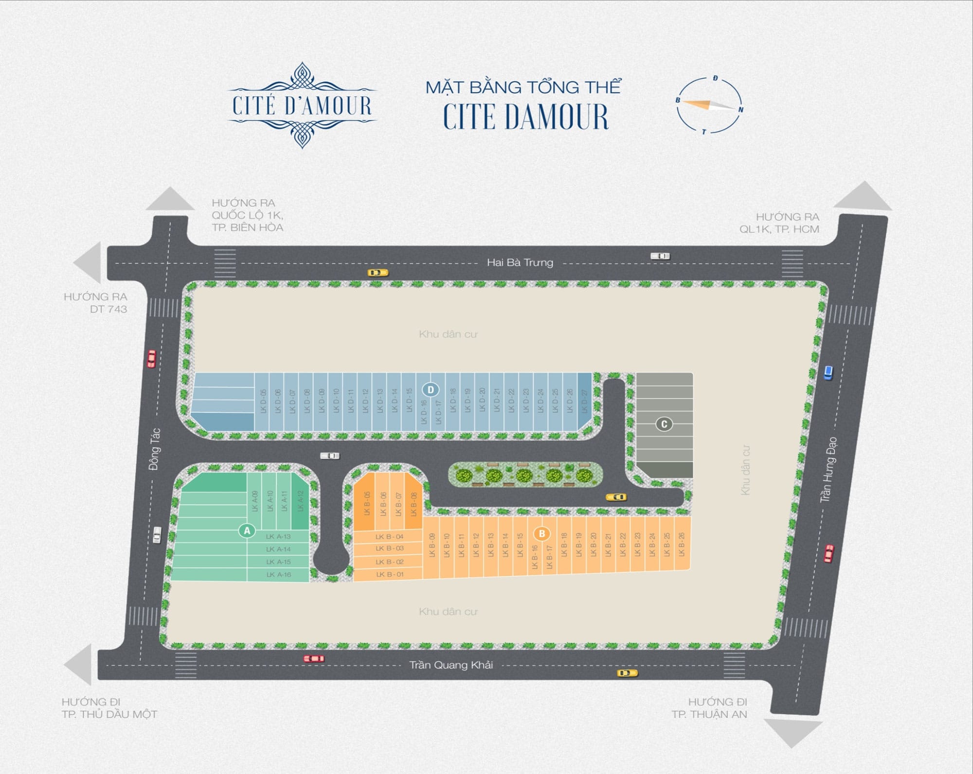 Mặt bằng Tổng thể Dự án Cite Damour Dĩ An Bình Dương được thiết kế trên qui mô 9.265,2 m2 đem đến 77 căn tuyệt tác nghệ thuật với thiết kế tân cổ điển có diện tích 60m2 – 120m2/ căn được xây dựng 1 trệt 2 lầu. CITÉ D’AMOUR đã được cấp phép quy hoạch hoàn chỉnh và hoàn công có sổ hồng riêng từng sản phẩm.