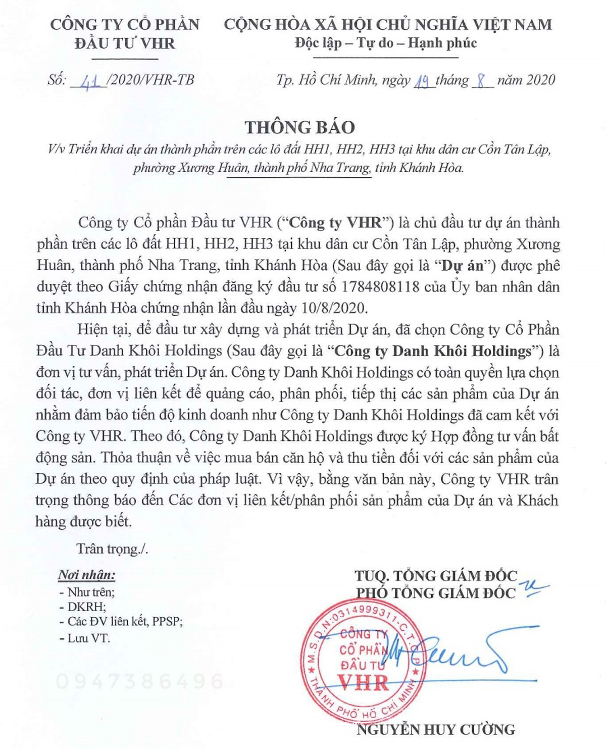 Hiện tại, để đầu tư xây dựng và phát triển Dự án, đã chọn Công ty Cổ Phần Đầu Tư Danh Khôi Holdings (Sau đây gọi là “Công ty Danh Khôi Holdings”) là đơn vị tư vấn, phát triển Dự án. Công ty Danh Khôi Holdings có toàn quyền lựa chọn đối tác, đơn vị liên kết để quảng cáo, phân phối, tiếp thị các sản phẩm của Dự án nhằm đảm bảo tiến độ kinh doanh như Công ty Danh Khôi Holdings đã cam kết với Công ty VHR. Theo đó, Công ty Danh Khôi Holdings được ký Hợp đồng tư vấn bất động sản. Thỏa thuận về việc mua bán căn hộ và thu tiền đối với các sản phẩm của Dự án theo quy định của pháp luật.
