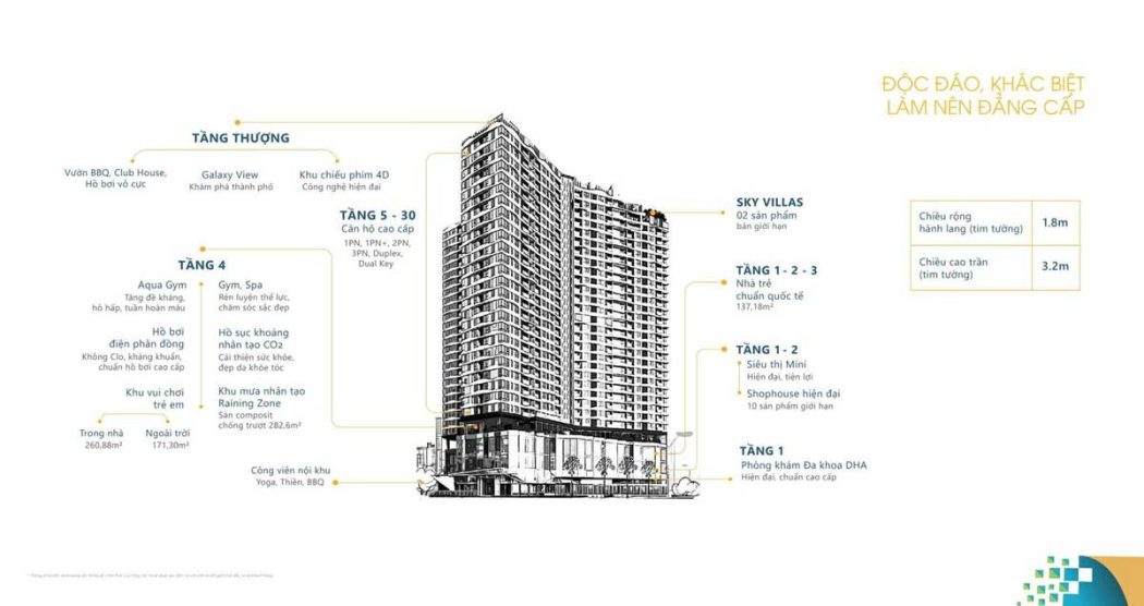 - Quy mô: 30 tầng nổi, trong đó khối đế 5 tầng là trung tâm thương mại, 3 tầng hầm, 25 tầng căn hộ (từ tầng 6 -> 30 là tầng căn hộ)