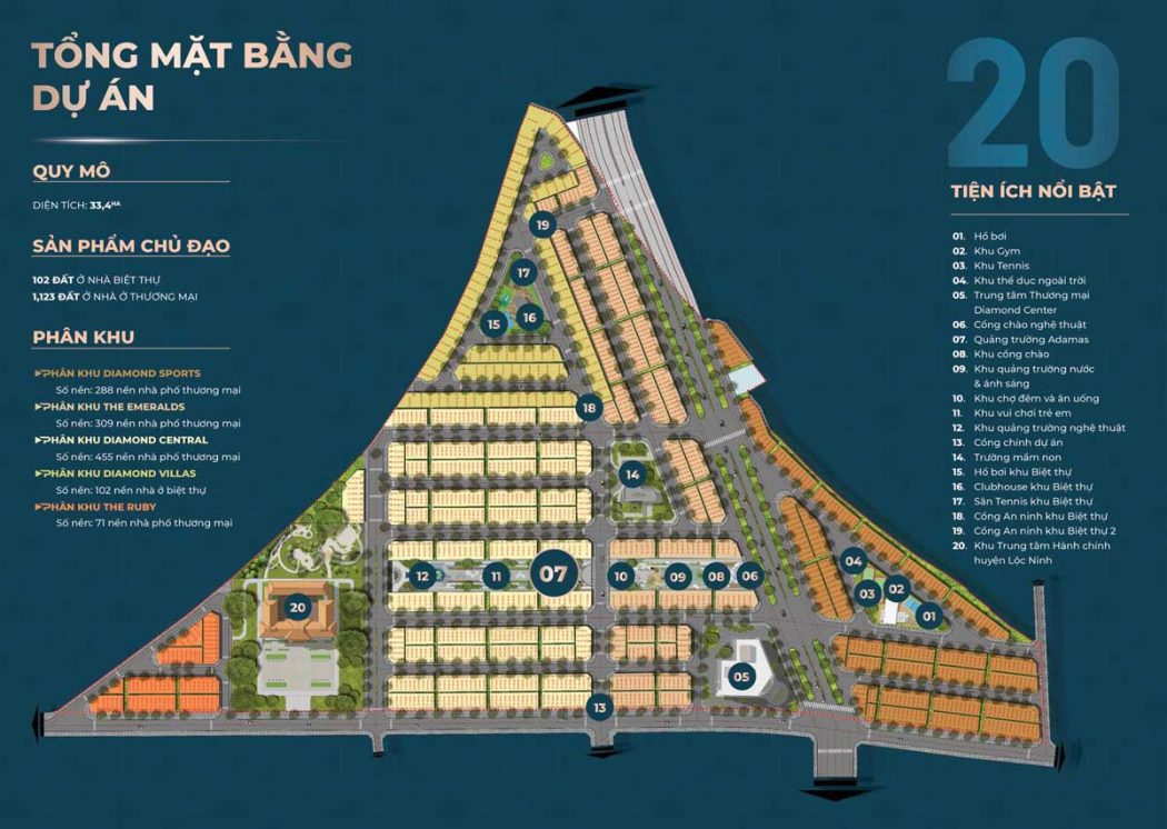 Dự án Diamond City Lộc Ninh Bình Phước có quy mô: 33,4ha gồm các sản phẩm chủ đạo: 102 đất nhà ở Biệt Thự & 1,123 đất ở nhà liên kế. Dự án được chia làm 5 phân khu: DIAMOND SPORTS – THE EMERALDS – DIAMOND CENTRAL – DIAMOND VILLAS – THE RUBY