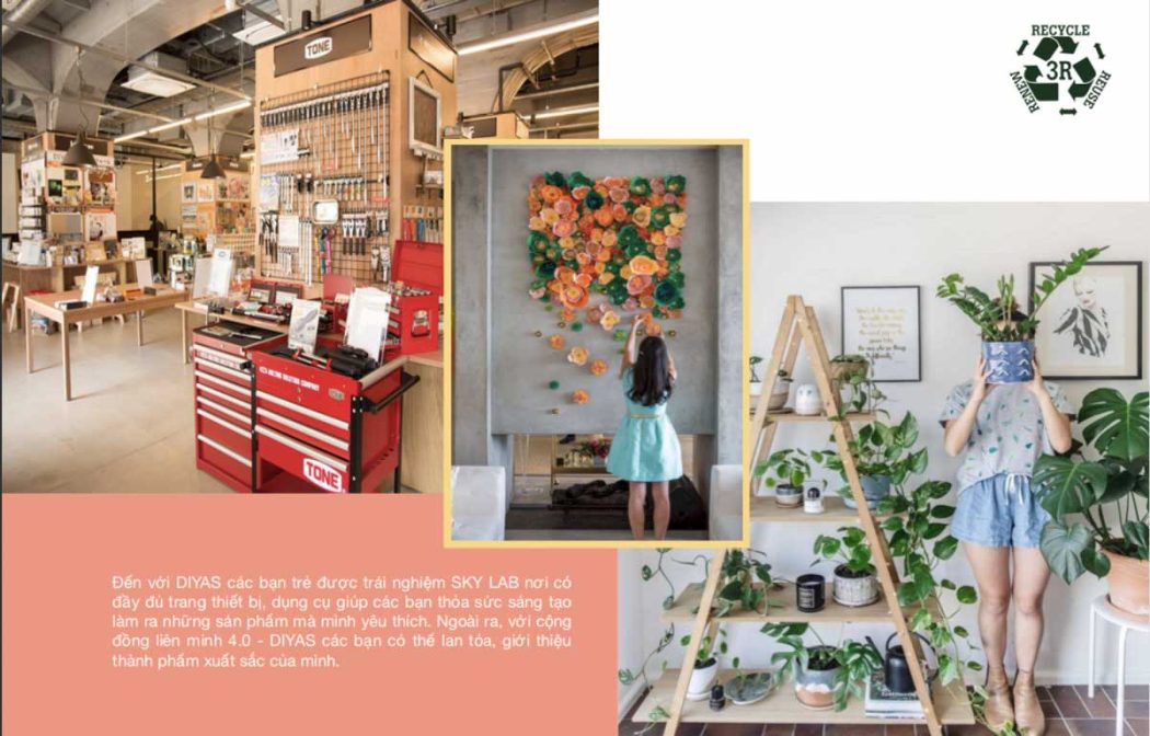 Đặc biệt hơn, Diyas Complex được phát triển gắn liền với yếu tố và giải pháp môi trường “3R”: Reduce – Reuse – Recycle (Tiết giảm – Tái sử dụng – Tái chế). “3R” và “Green living” là những thuật ngữ không thể tách rời khỏi sự sáng tạo của người trẻ, đặc biệt là liên minh cộng đồng DIY. Chưa hết, tại căn hộ studio DIY có hẳn một phòng Diyas Lab chuyên nghiệp. Phải nói đây một không gian thoả sức sáng tạo, nơi có đầy đủ trang thiết bị, dụng cụ chuyên dụng như máy in 3D, máy cắt laser, các loại cưa mài cắt cầm tay… cùng sự hỗ trợ tối đa đến từ đội ngũ hỗ trợ chuyên nghiệp. Khi cần, hãy đến đây và mọi ý tưởng của bạn sẽ trở thành hiện thực.