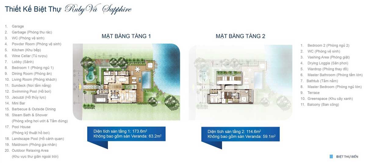- Khu biệt thự: 36 căn biệt thự nghỉ dưỡng cao cấp có khuôn viên riêng hồ bơi riêng