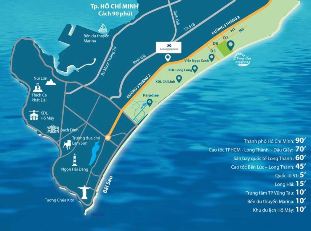 Theo thông tin từ Google Maps thì Dự án Blue Sapphire Vũng Tàu tiếp cận với các khu vực lân cận như sau:
