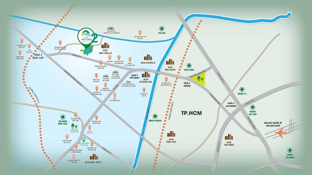 Vị trí Dự án Khu đô thị Cát Tường Phú Sinh 2 tọa lạc trên mặt tiền Tỉnh lộ 9, xã Mỹ Hạnh Bắc và xã Đức Lập Hạ, Đức Hòa, Long An – vị trí “vàng” thuộc trung tâm đô thị Tây Bắc TP.HCM, tiếp giáp trực tiếp với Củ Chi, Hóc Môn, Bình Chánh của TP.HCM. Từ dự án Cát Tường Phú Sinh, cư dân chỉ mất khoảng 25 phút để tiếp cận sân bay Tân Sơn Nhất, khoảng 35 phút đến trung tâm Quận 1.
