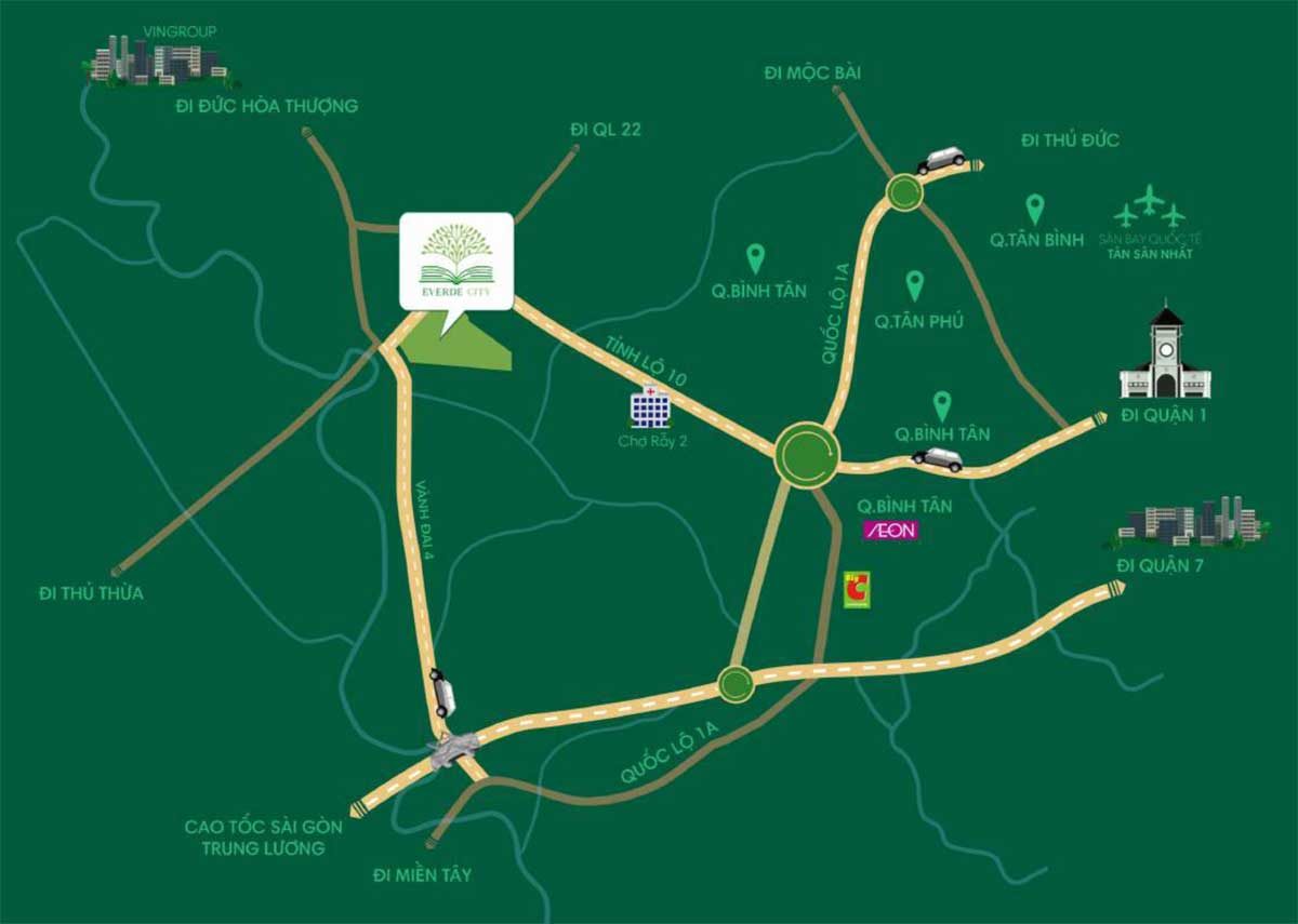 Vị trí Everde City tiếp cận TP.HCM và nối liền ĐBSCL với miền Đông Nam bộ. Từ vị trí dự án Everde City đi đến ranh giới huyện Bình Chánh (TP.HCM) chỉ mất 8 phút đi xe máy. Ngoài ra, khu vực huyện Đức Hoà và các vùng lân cận hiện đang quy hoạch rất nhiều dự án giao thông giúp người dân ĐBSCL đi Đông Nam bộ nhanh chóng và dễ dàng hơn như cao tốc Bến Lức – Long Thành (nối Long An – TP.HCM – Đồng Nai), đường Vành đai 3, đường Vành đai 4…
