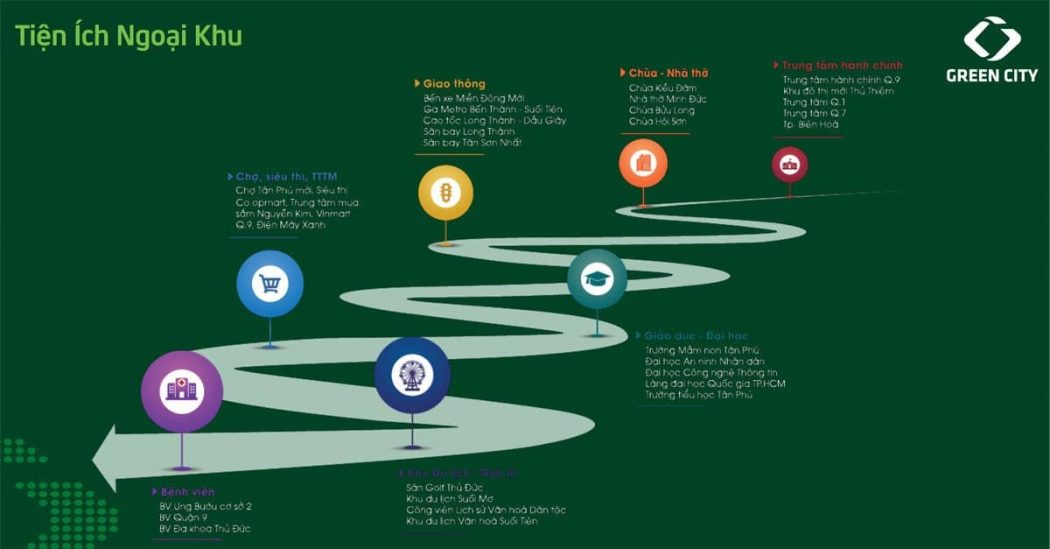 Ngoài ra, cư dân của khu đô thị Green City còn sở hữu tiện ích ngoại khu hiện hữu vượt trội bao gồm đa dạng các loại hình như: cơ quan hành chính, bệnh viện, trường học, bệnh viện, trung tâm tôn giáo, siêu thị, chợ, trung tâm thương mại,…