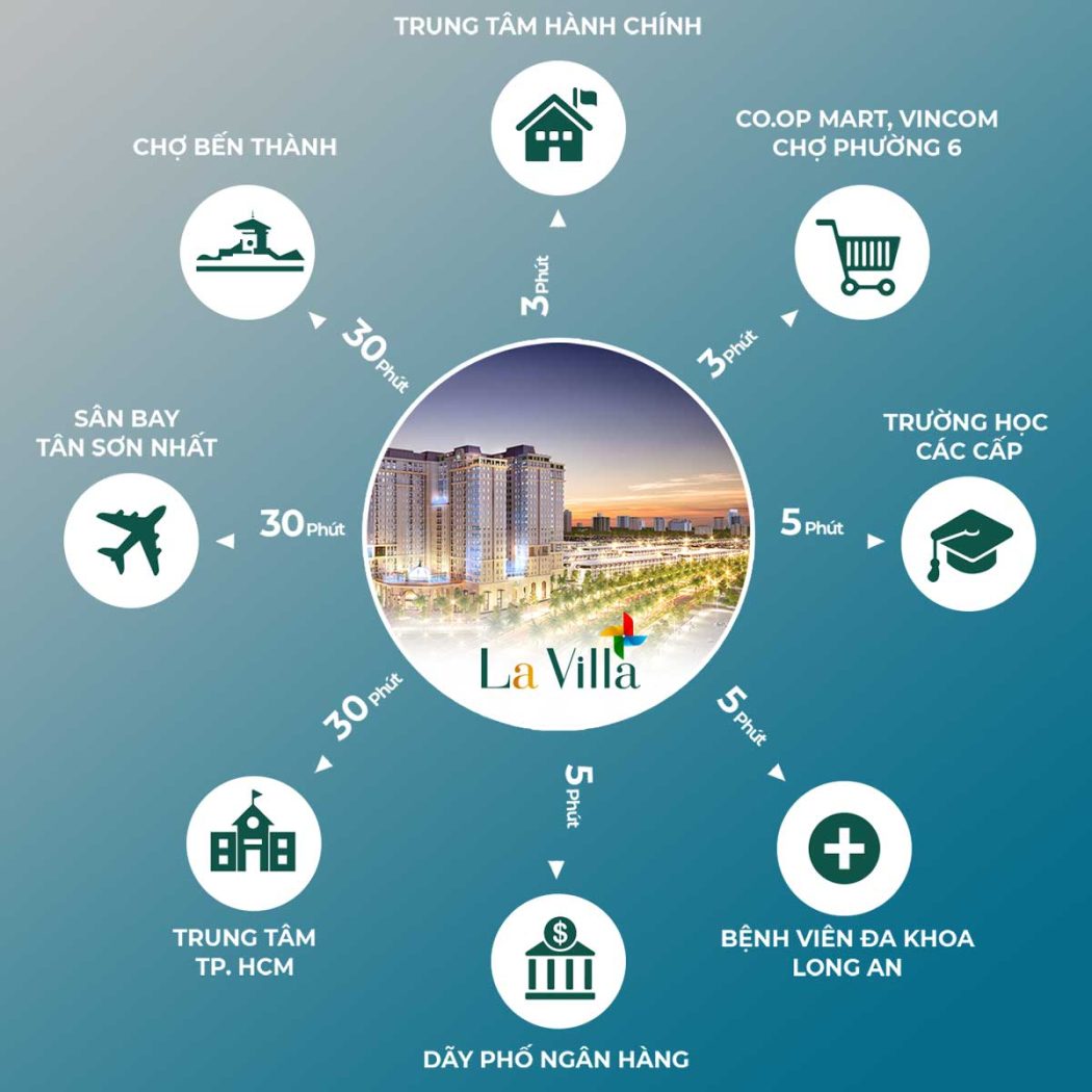 Với vị trí đắc địa La Villa Green City được bao bọc bởi những dịch vụ tiện ích ngoại khu hoàn hảo. Liền kề trung tâm hành chính tỉnh, trung tâm Kinh tế – Văn hóa – Chính trị tỉnh Long An. Liền kề các trường CĐ, ĐH: ĐH Kinh tế – Công nghiệp Long An, CĐSP Long An và hệ thống trường học các cấp. Chỉ vài phút di chuyển đến Trung tâm thương mại, hệ thống ngân hàng, cảng quốc tế Long An…