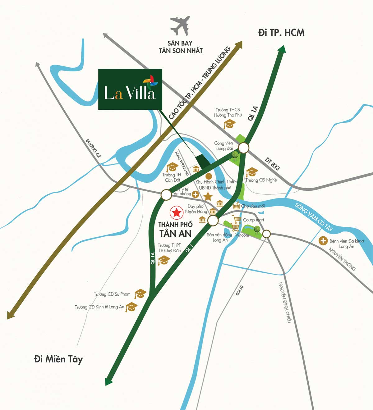 Như dòng chảy thịnh vượng ôm lấy kim thành, Khu đô thị La Villa Green City tọa lạc tại mảnh đất “độc tôn” giữa thành phố trẻ Tân An năng động. Dự án sở hữu vị trí siêu đắc địa, 2 mặt tiền gồm Quốc Lộ 1A, Hùng Vương là cửa ngõ lưu thông chính kết nối với TP.HCM và 13 tỉnh miền tây. Một mặt trải dài theo dòng sông Vàm Cỏ Tây kết nối trực tiếp với cảng quốc tế Long An cũng như các cảng lớn trong vùng.