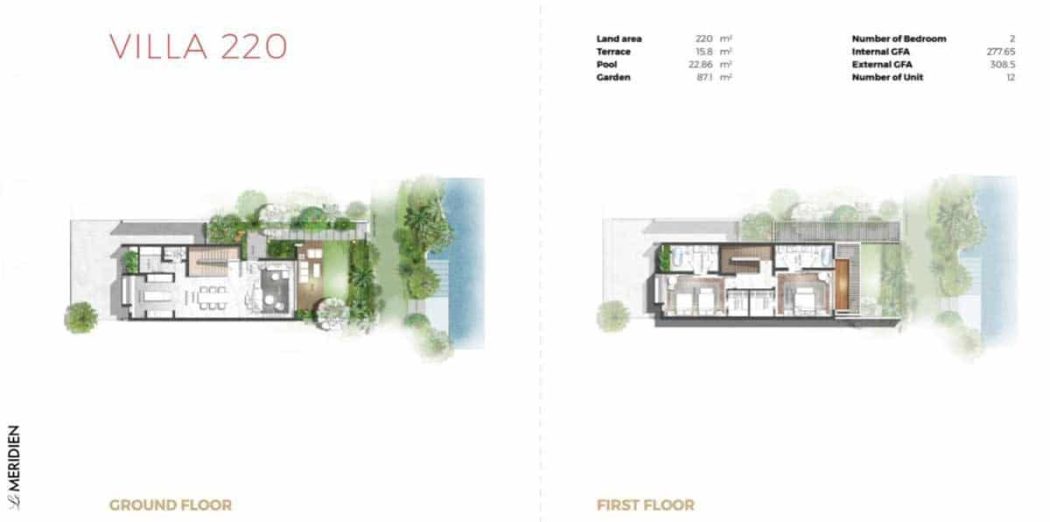 Dự án Le Meridien được xây dựng trên khu đất có tổng diện tích 12 ha với mật độ xây dựng 25%. Quy mô dự án gồm, khu khách sạn 5+ sao, căn hộ cao cấp và63 căn biệt thự gồm 4 loại biệt thự từ 237 – 700 m2. Các villa có 3 hướng nhìn: hướng biển, hướng sân golf và hướng Đà Nẵng – Hội An.