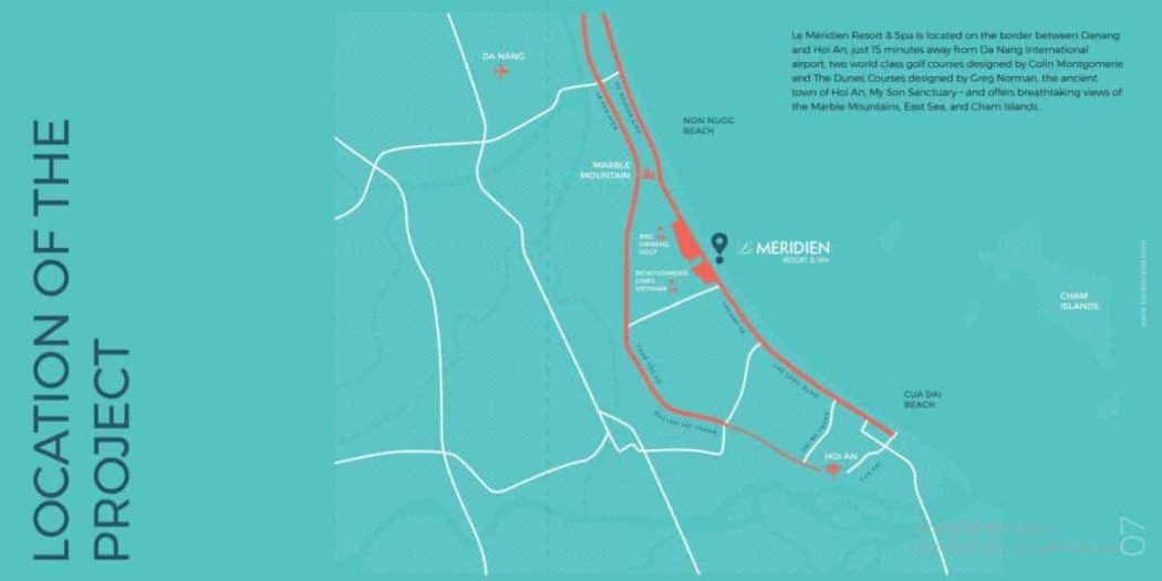 Không những thế, dự án Le Meridien Đà Nẵngcòn có một vị trí địa lý rất thuận lợi về du lịch nghỉ dưỡng, nằm ở cửa ngõ đến ba di sản văn hóa thế giới do UNESCO công nhận gồm: phố cổ Hội An, Thánh địa Mỹ Sơn và Cố đô Huế, rất gần với trung tâm thành phố và sân bay quốc tế Đà Nẵng trong khi vẫn sở hữu được một không gian yên tĩnh, hiện đại và biệt lập với cuộc sống nhộn nhịp hàng ngày nhưng vẫn đáp ứng được các nhu cầu về thương mại dịch vụ, vui chơi giải trí, tham quan của du khách và cư dân.