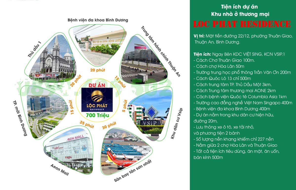 Dự án Lộc Phát Residence sở hữu vị trí độc tôn ngay mặt tiền đường Đường 22 tháng 12, Phường Thuận Giao, TX Thuận An, Bình Dương. Dự án nằm giữa 2 trục giao thông huyết mạch là Quốc lộ 13 và cao tốc Tân Vạn, kết nối với Đại lộ Phạm Văn Đồng và QL 1A chỉ trong 10 phút di chuyển. Là dự án duy nhất tại TT Thuận An, nằm ngay mặt tiền đường giữa chợ đêm Hòa Lân & chợ Thuận Giao, liền kề các cụm công nghiệp lớn tại Bình Dương như: KCN Vietnam Singapore (VSIP), KCN Việt Hương…