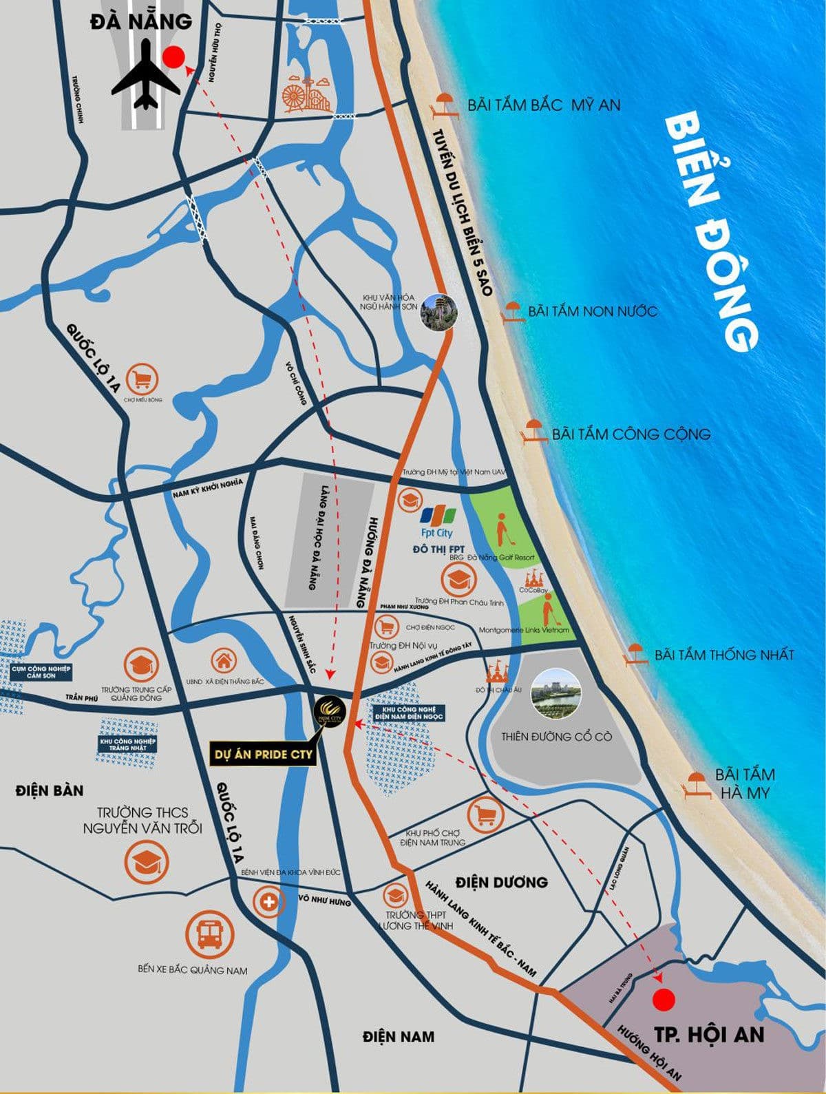 Dự án Pride City là tên thương mại của Khu đô thị 2A mở rộng có quy mô 35,7 ha nằm trong chuỗi dự án mới của khu đô thị Điện Nam – Điện Ngọc, tỉnh Quảng Nam. Vị trí Pride City chỉ cách trục đường Trần Hưng Đạo hơn 500m, mặt tiền đường Trần Đại Nghĩa – tuyến đường huyết mạch nối Đà Nẵng với Phố Cổ Hội An. Được ví như viên ngọc Nam Đà Nẵng, khu đô thị Pride City đang sở hữu tiềm năng lớn về du lịch, nghỉ dưỡng, đảm bảo về tính an toàn, khả năng khai thác và sinh lời cao theo thời gian đáp ứng tốt mục đích đầu tư. Prinde City như một nét chấm phá độc đáo hiện hữu trên bức tranh sinh động cuộc sống của khu Nam Đà Nẵng.