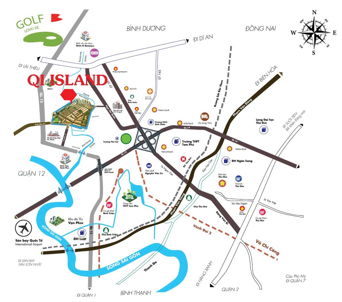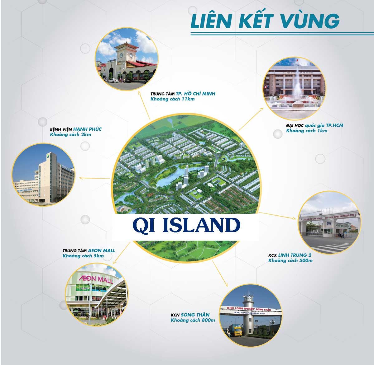 Đặc biệt, đất nền Qi Island nằm trên địa bàn xã Vĩnh Phú, thị xã Thuận An, tỉnh Bình Dương. Thoạt nghe Bình Dương có vẻ như hơi xa so với Sài Gòn nhưng thực tế chỉ cách Thủ Đức Sài Gòn chỉ nửa tuyến bên kia đường Ngô Chí Quốc. Vị trí Khu Đô Thị Qi Island còn gần kề với tuyến Xa lộ Hà Nội, Tỉnh lộ 43, UBND phường Bình Chiểu, khu chế xuất Linh Trung II, khu công nghiệp Bình Chiểu, bệnh viện Hạnh Phúc, bệnh viện Quận Đoàn 4,…