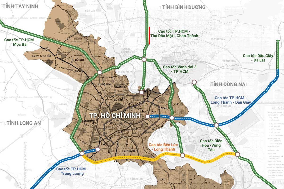 - Tuyến cao tốc Tp. Hồ Chí Minh –Thủ Dầu Một – Chơn Thành có tổng chiều dài 69km với tổng mức đầu tư 11.000 tỷ đồng.