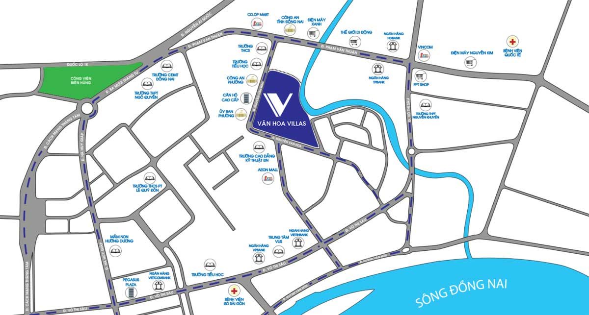 Dự án Văn Hoa Villas tọa lạc ngay trung tâm khu kinh tế – tài chính của TP Biên Hòa, khu vực phát triển năng động, cơ sở hạ tầng hoàn thiện của tỉnh Đồng Nai. Biệt thự Văn Hoa Villas không chỉ mang lại cho cư dân chuỗi tiện ích cao cấp, mà còn cung cấp hệ thống giao thông liền mạch và hiện đại, dễ dàng kết nối với các khu hành chính – kinh tế quan trọng bởi Văn Hoa Villas Đồng Nai tiếp giáp với đường Phạm Văn Thuận, Võ Thị Sáu, Nguyễn Ái Quốc rất thuận tiện di chuyển đến quốc lộ 1K, quốc lộ 1A. Đồng thời liên kết nhanh chóng tới Cao tốc Bến Lức – Long Thành, Cao tốc Dầu Giây – Phan Thiết, Cao tốc Dầu Giây – Đà Lạt và Cao tốc Biên Hòa – Vũng Tàu, Tuyến Metro số 1 nối Bến Thành – Suối Tiên đến Biên Hòa.