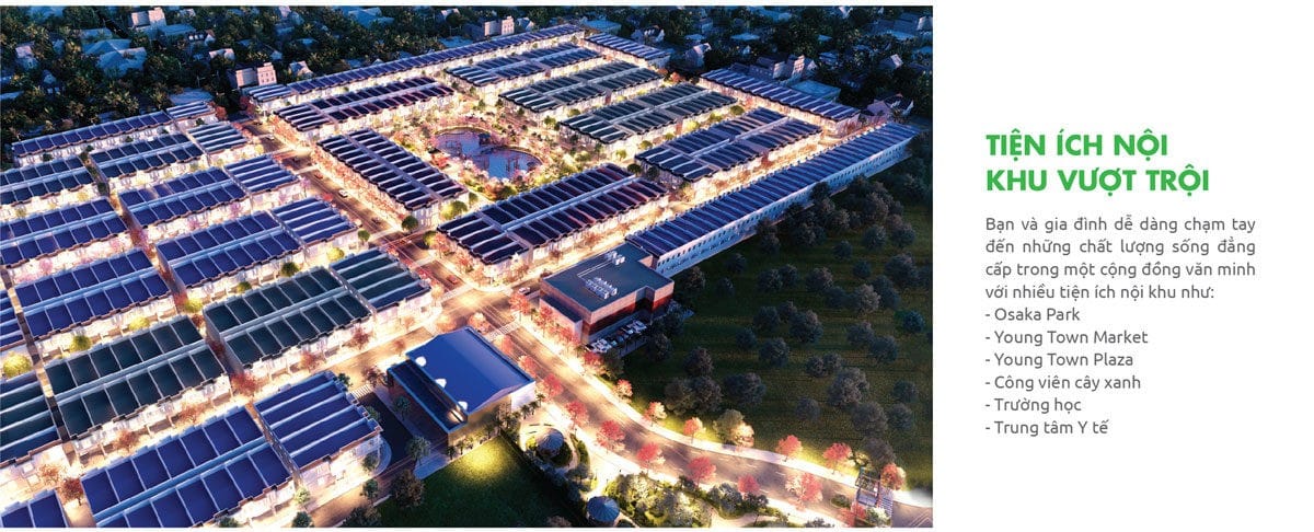 7. Khu đô thị xanh, tiện ích hoàn chỉnh: Phát triển dự án theo mô hình chuẩn sống xanh, Thắng Lợi Group đã mạnh tay đầu tư 14.500 m2 cho mảng xanh và tiện ích với: Công viên phong cách Nhật Bản -Osaka Park, chợ Young Town, TTTM Young Town, Công viên cây xanh, Trường Tiểu Học và Trung tâm y tế.