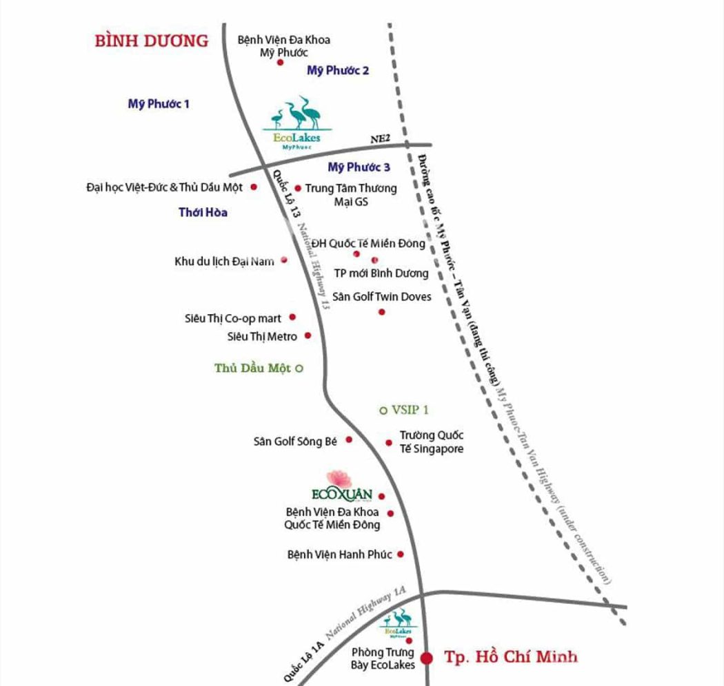 - Cách trung tâm TP HCM về phía Bắc trên tuyến quốc lộ 13. Nơi đây còn sở hữu trục giao thông huyết mạch của cả nước cùng đường cao tốc dài 35 km nối liền Ecolakes – Tân Vạn – Quận 9 thành phố Hồ Chí Minh.