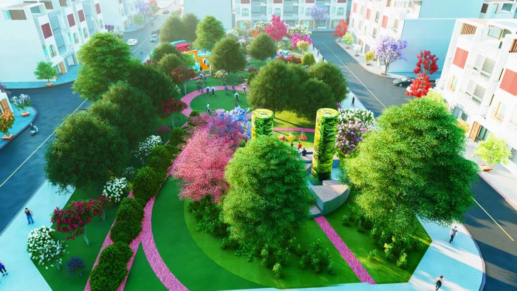 Khu cây xanh – công viên: Được bố trí để phục vụ cho khu ở, tại khu vực này không xây dựng công trình kiến trúc. Có thể kết hợp lắp đặt các thiết bị tập thể thao phục vụ hàng ngày của người dân. Tuy nhiên mật độ xây dựng không quá 5%, cây xanh được trồng trong khu vực này có thể là cây tán rộng hoặc cây bụi, vườn hoa..