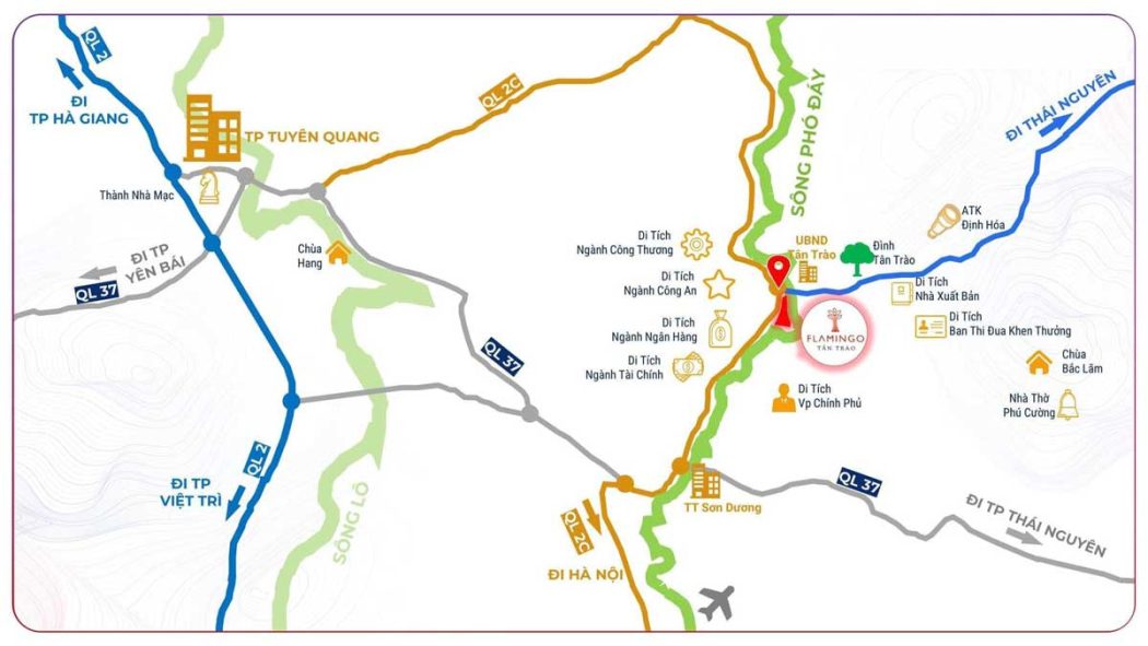 Vị trí Dự án Flamingo Tân Trào tọa lạc xã Tân Trào, huyện Sơn Dương, tỉnh Tuyên Quang, nằm trên mảnh đất “vàng” đắc địa, thừa hưởng mọi ưu điểm vượt trội của Khu Di tích lịch sử Quốc gia Tân Trào. Flamingo Tân Trào nằm ngay bên dòng sông Đáy Tân Trào – vùng đất giàu truyền thống văn hóa cách mạng, khi tựa lưng vào núi, hướng ra hồ, ôm trọn cảnh quan xanh mát, trữ tình. Đây chính là thế đất “tựa sơn hướng thủy”, được coi là tiêu chuẩn vàng phong thủy trong giới bất động sản, là mảnh đất được nhiều chuyên gia, nhà đầu tư săn đón. Theo quan niệm Á Đông, nhà ở phía trước có nước lớn tức thủy khí nhiều, dễ sinh tài lợi, thu hút thịnh vượng, phía sau có núi hay thế dựa, tọa lạc trên mặt đất bằng phẳng tạo sự vững chắc, đem đến đại cát, hanh thông cho chủ nhà.