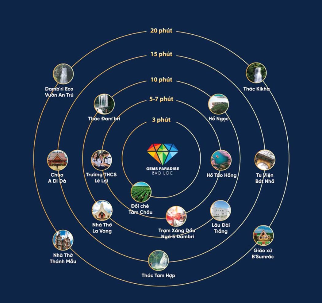 Trong vòng bán kính 25 phút di chuyển, Gems Paradise Bảo Lộc liền kề chợ Bảo Lâm, trung tâm TP. Bảo Lộc, Co.op Mark Bỏa Lộc, UBND TP. Bro Lộc, Bệnh viện II Lâm Đồng, bưu điện TP. Bảo Lộc, hệ thống trường THCS-THPT Lộc Ngãi,…