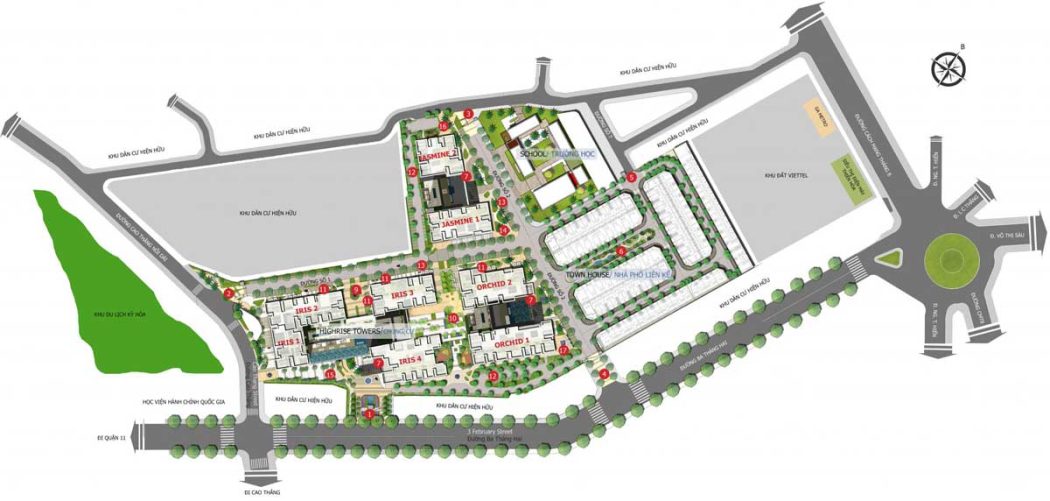 - Tổng diện tích quy hoạch: 68.513,7 m2, gồm 8 tòa căn hộ cao tầng và khu nhà phố liên kế