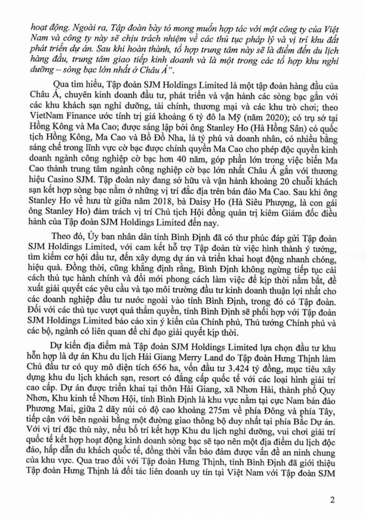 SJM Holdings Limited – Tập đoàn hàng đầu Châu Á, dự kiến đầu tư 5-6 tỷ USD biến Bình Định thành điểm đến du lịch hàng đầu và là một trong các tổ hợp khu nghỉ dưỡng – sòng bạc lớn nhất Châu Á.