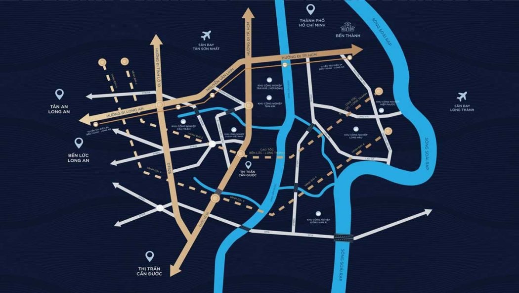 Dọc theo trục Quốc Lộ 50, cư dân cũng dễ dàng kết nối với TP.HCM cũng như các tỉnh miền Tây như gò Mỹ Tho, Gò Công, Bến Tre, Tiền Giang…thông qua hệ thống các đường tỉnh lộ như DT 830, DT 826,..