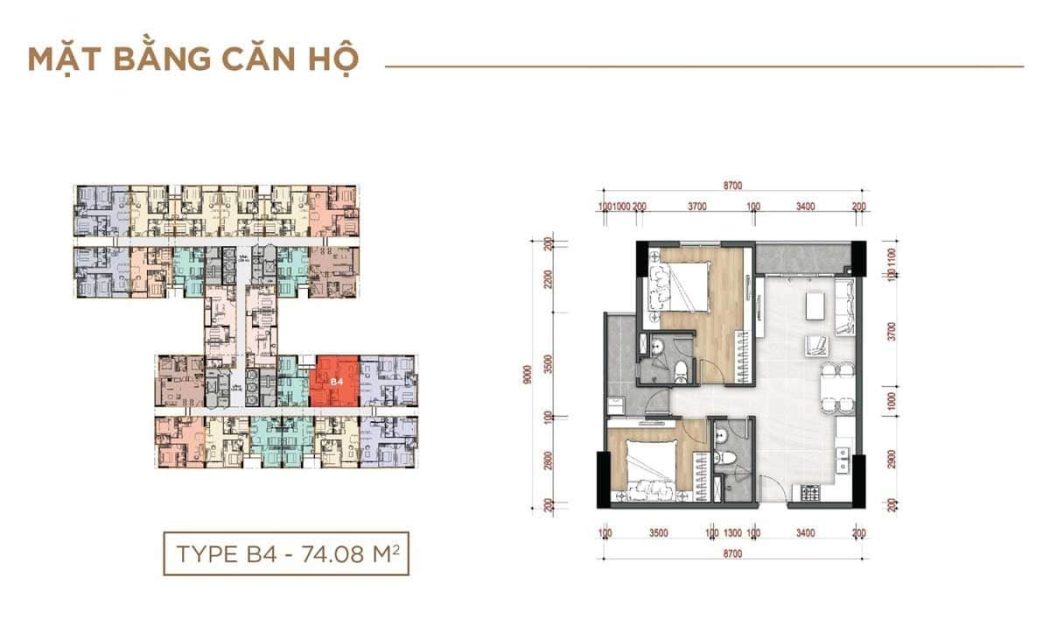 - Thiết kế căn hộ 2PN + 2WC diện tích 66,5 – 79,3m2