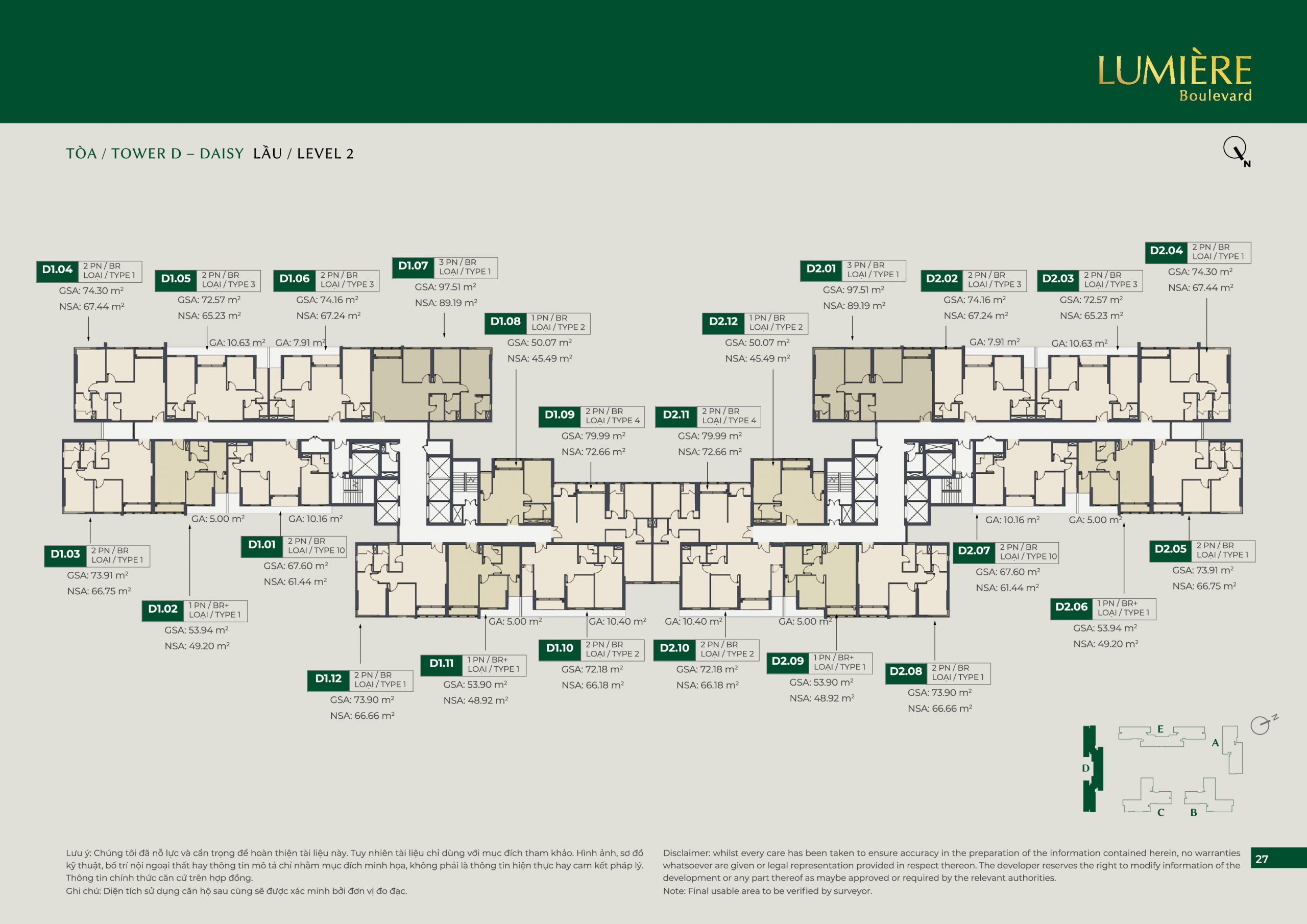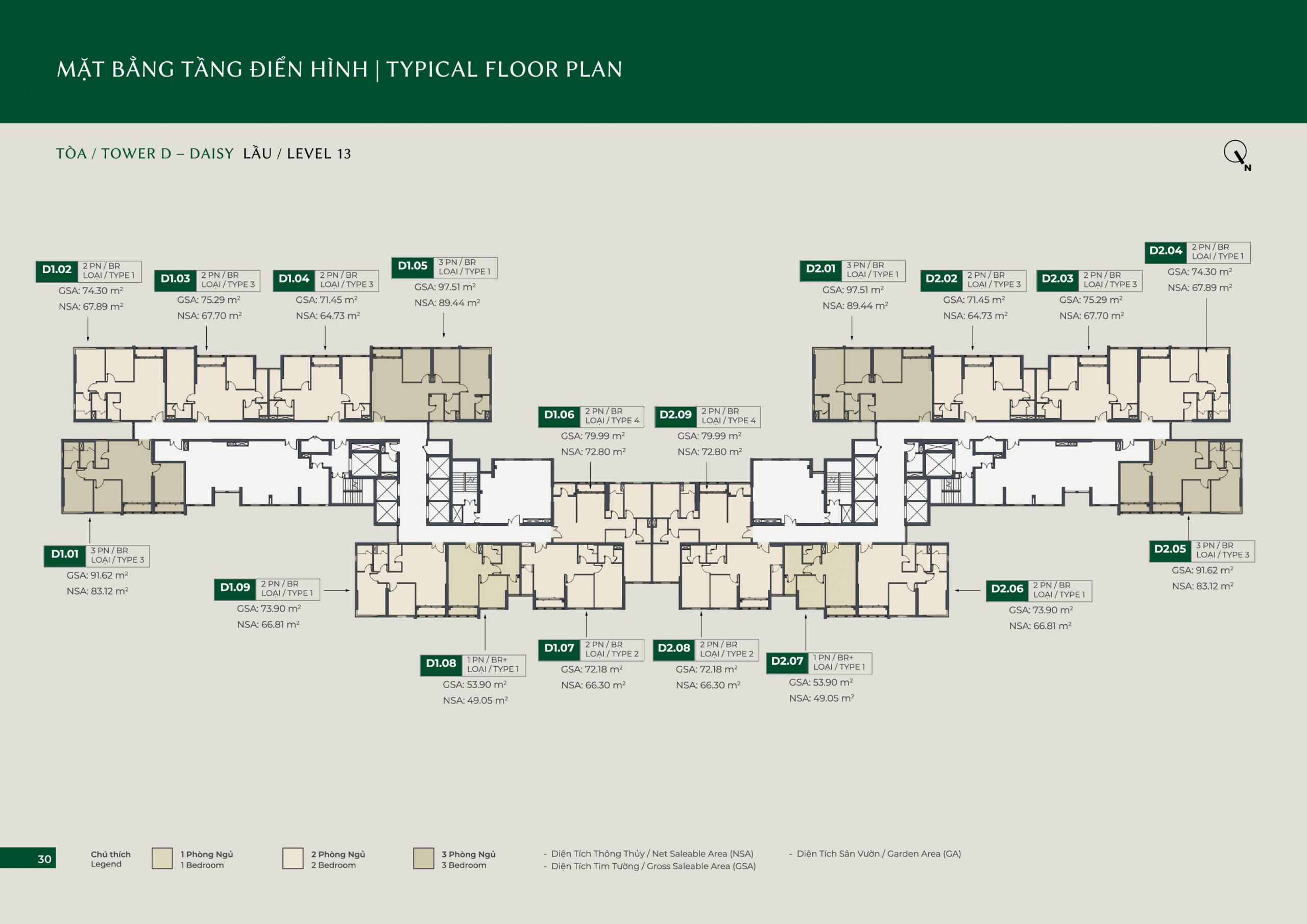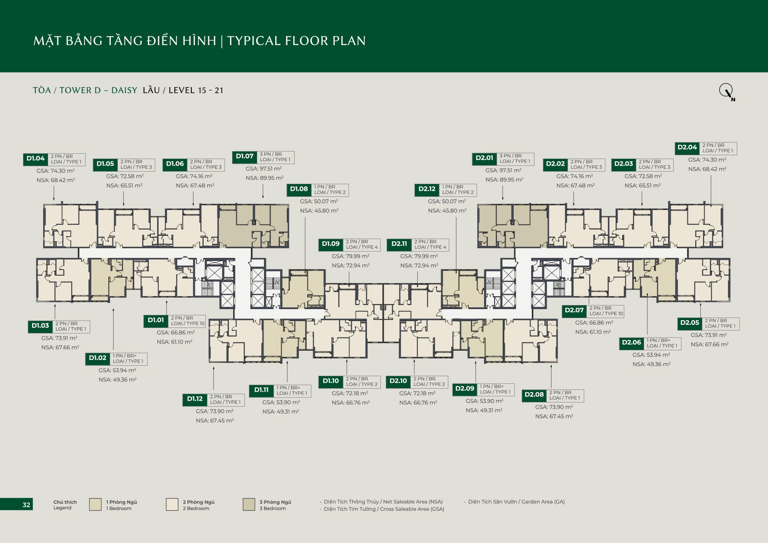 - Căn hộ 2PN: Diện tích 67 – 76m2