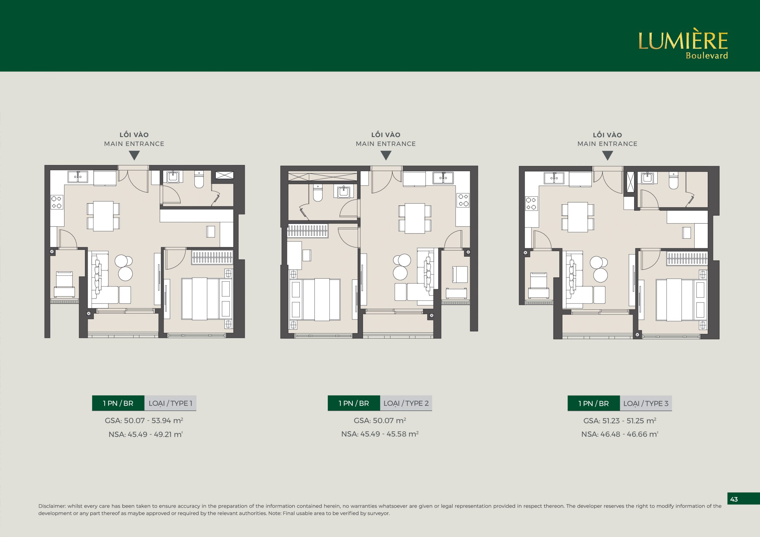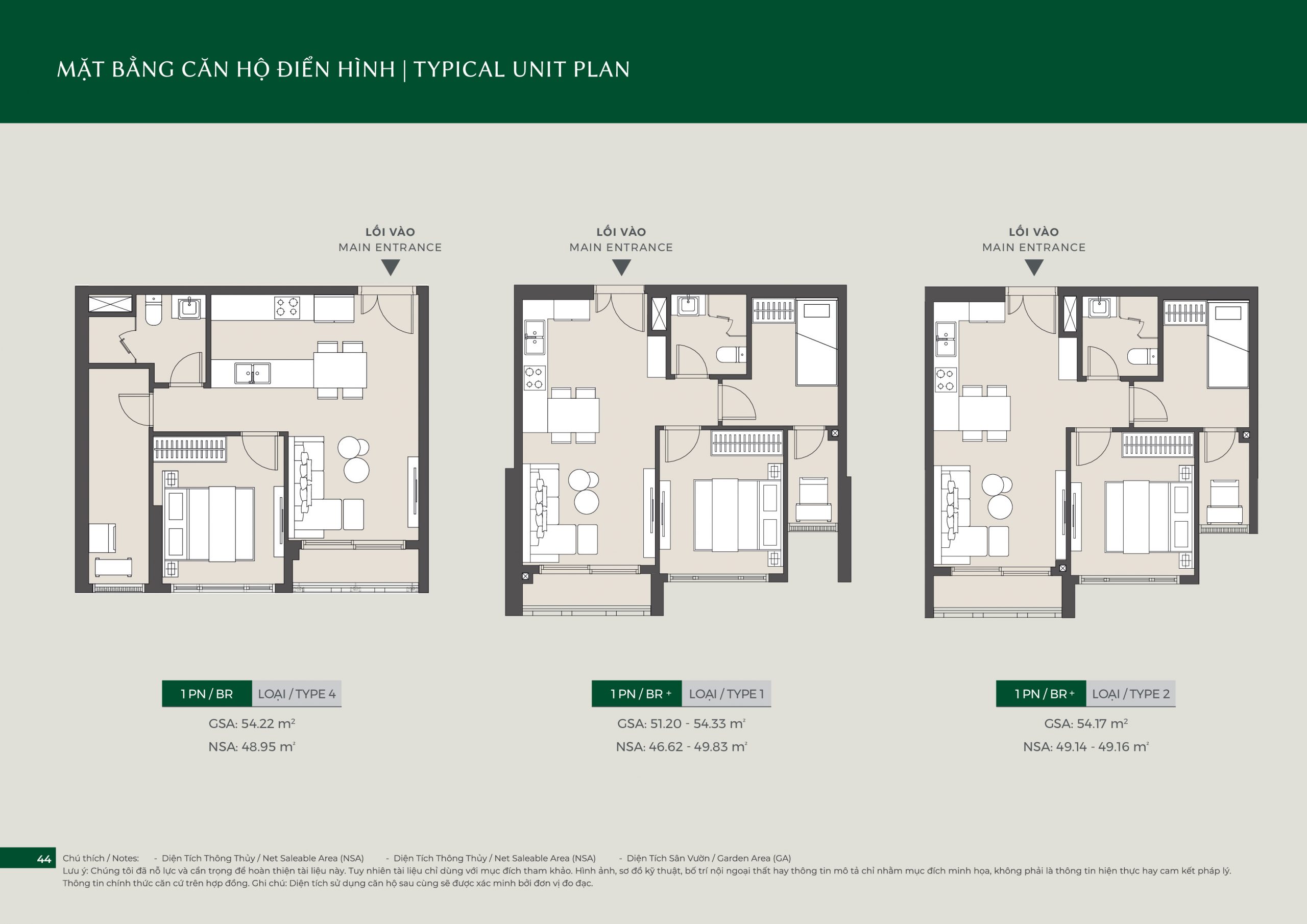 - Căn hộ 1PN+: Diện tích 51 – 54m2