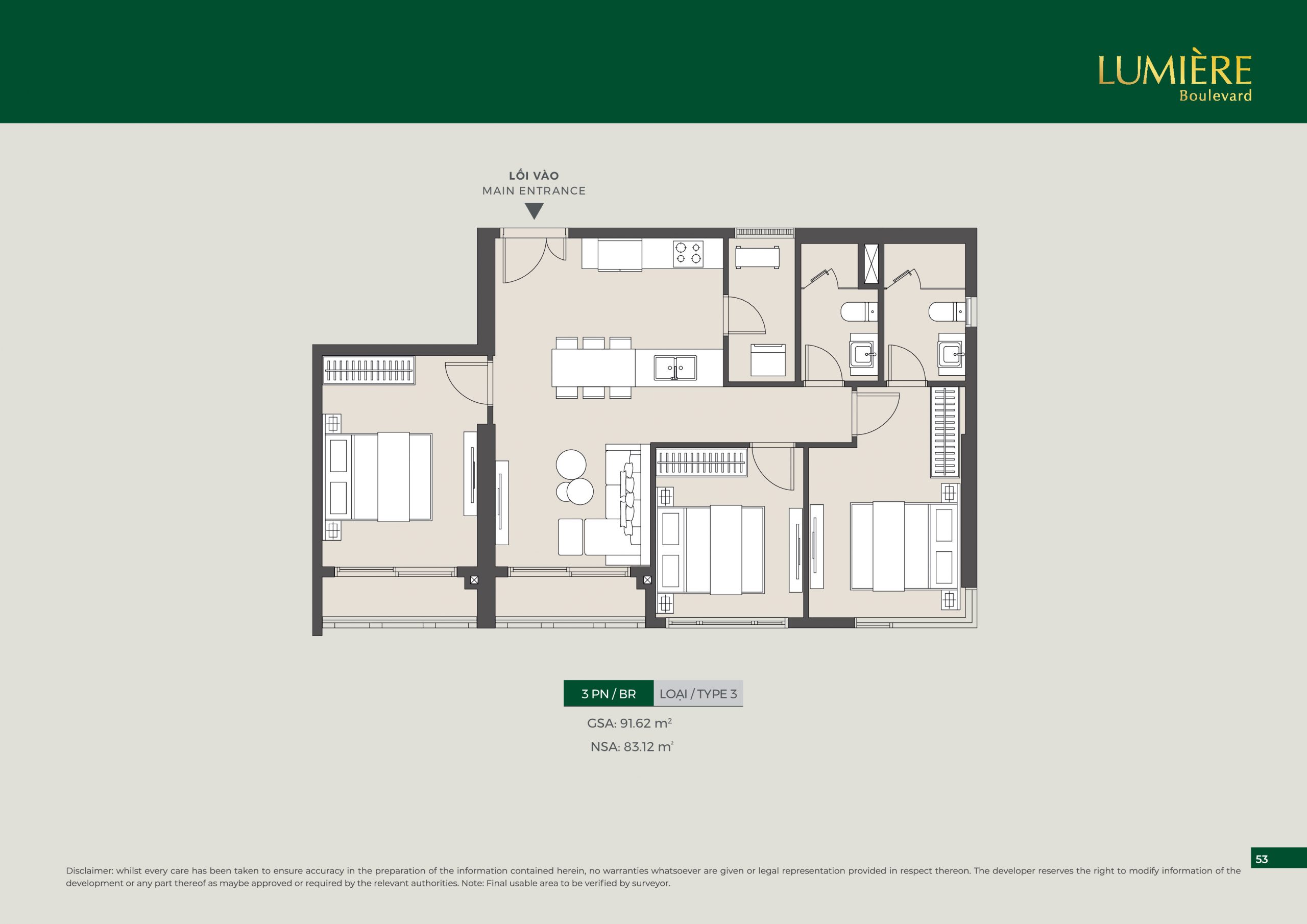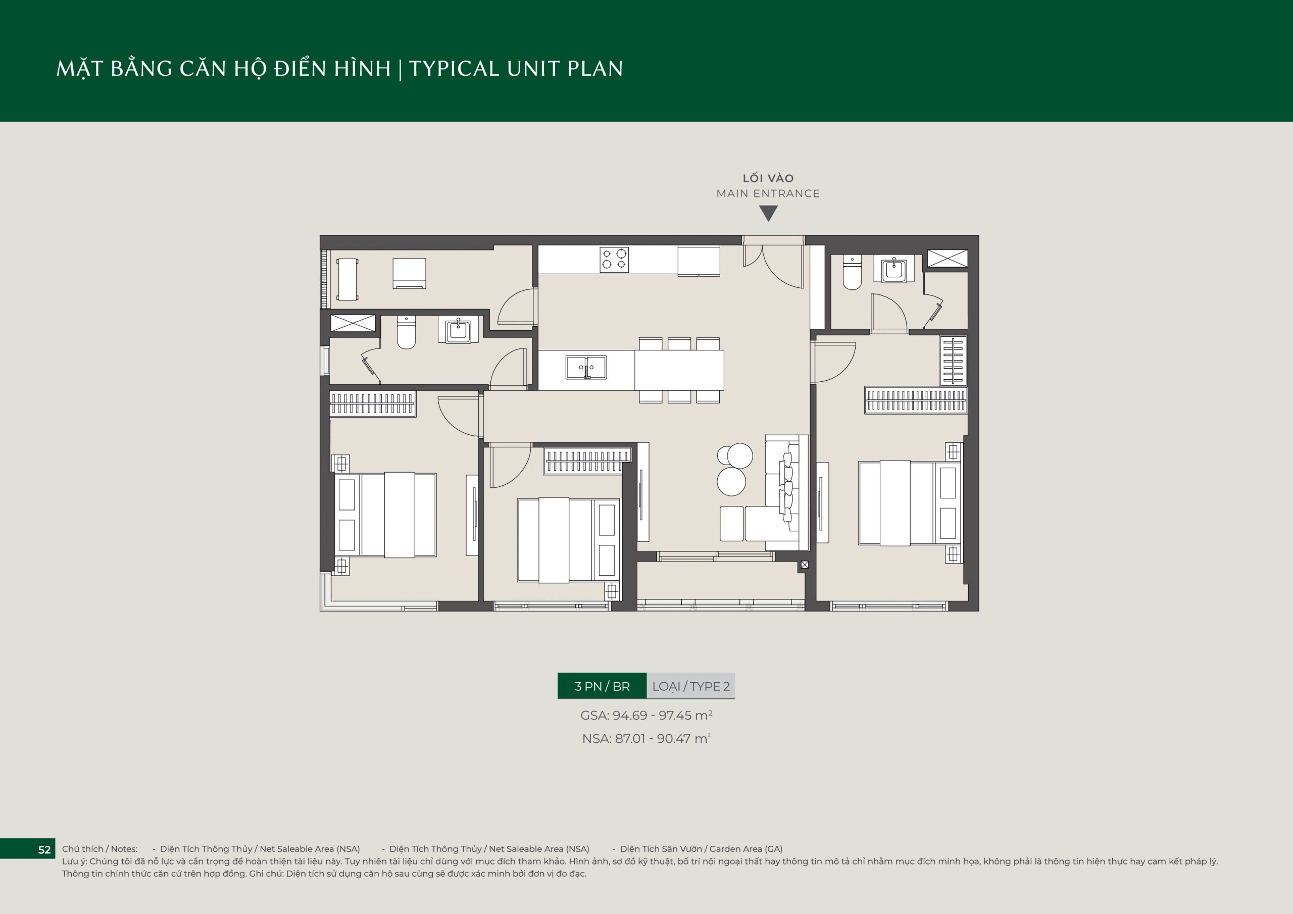 - Căn hộ 3PN: Diện tích 90 – 99m2