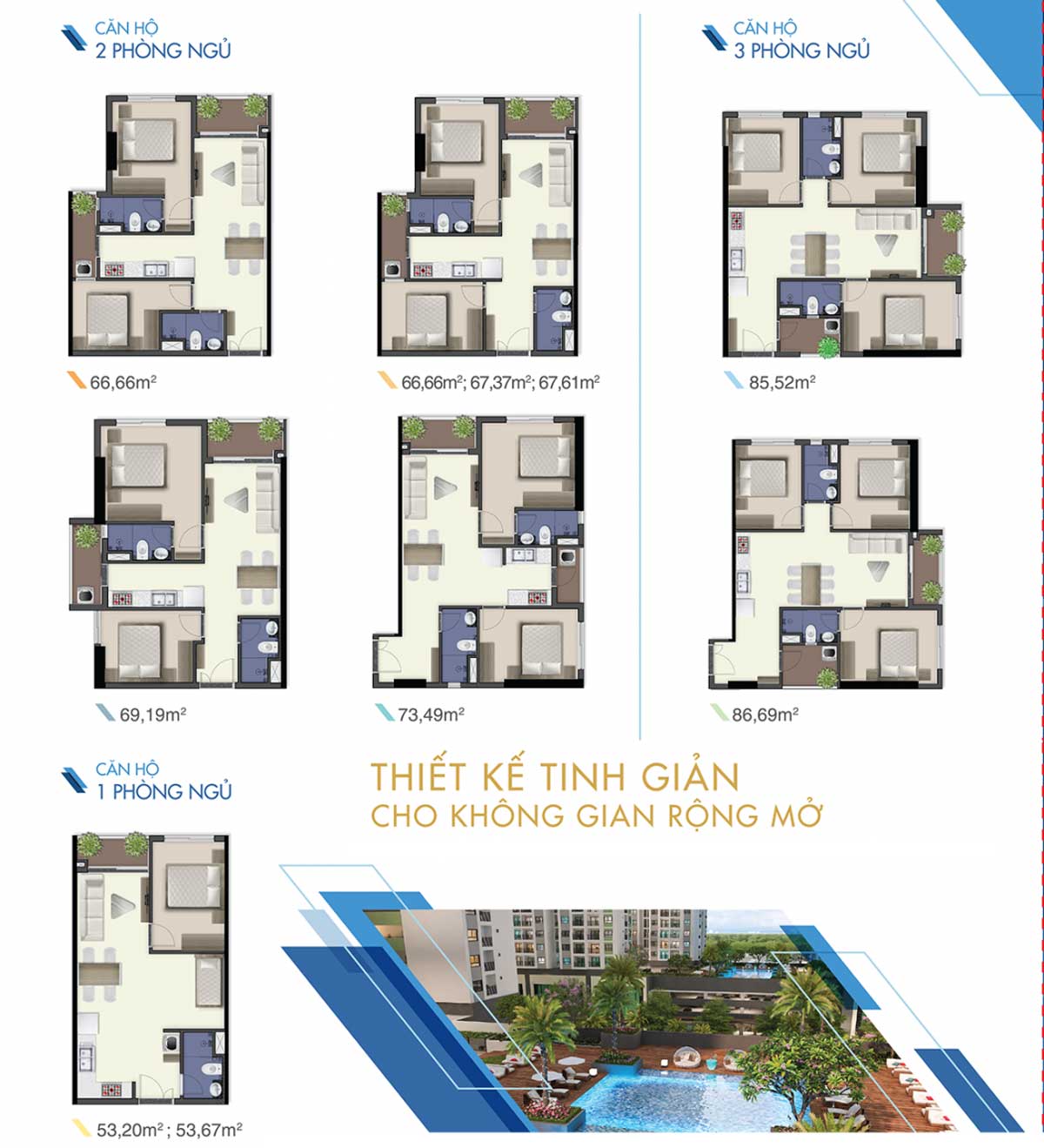 Diện tích các căn 2 phòng ngủ từ 65 – 73m2, căn 3 phòng ngủ từ 82 – 95 m2. Thiết kế 100% các căn hộ đều có logia phơi đồ, ban công thoáng rộng, không gian mở với cửa sổ lớn.