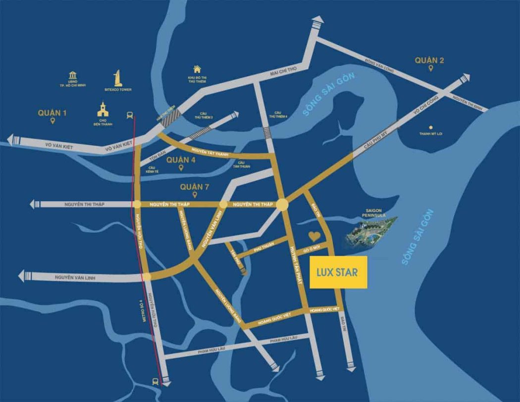 Được xây dựng nằm mũi đèn đỏ xung quanh tuyến Đào Trí, con đường nhộn nhịp, nơi hội tụ nhiều dự án căn hộ, nhà ở cao cấp. Tạo một làn sóng mạnh mẽ khi khu vực này ngày càng phát triển với nhiều hình thức bất động sản cao cấp, dự án án sẽ là cơ hội đầu tư cho những ai biết nhìn ra đặc trưng của khu vực vày. Trải theo bờ sông Sài Gòn, cư dân Lux Star quận 7 thừa hưởng trọn vẹn bầu không khí trong lành mát mẻ mang ý nghĩa phong thủy rất lớn, đem tại tài lộc và sự thịnh vượng cho gia chủ. Hơn nữa, được bao quanh bởi khuôn viên xanh sẽ tạo môi trường sống lý tưởng, gần gũi cùng thiên nhiên.