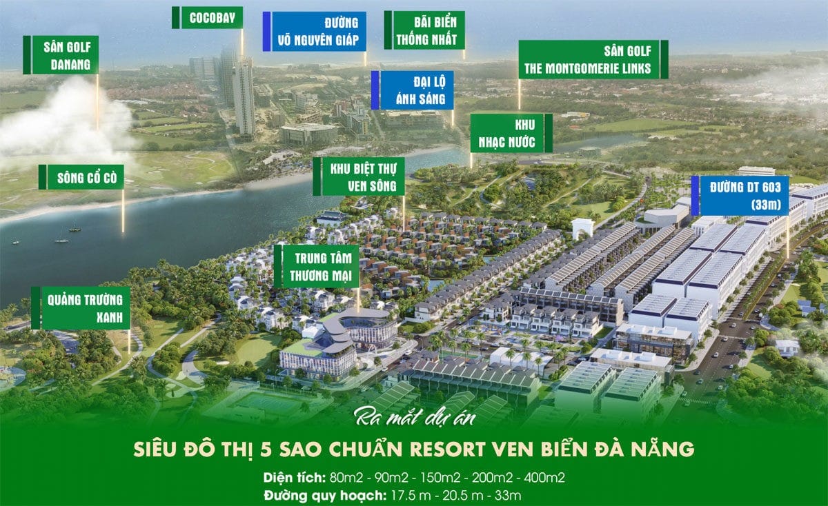 - Phía Bắc giáp tổ hợp du lịch và giải trí Cocobay và đường Dũng Sĩ Điện Ngọc, kết nối thẳng về trục đường Lê Văn Hiến – Trần Đại Nghĩa nối dài.