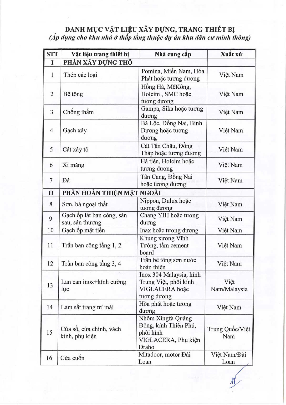 DANH MỤC VẬT LIỆU XÂY DỰNG, TRANG THIẾT BỊ NHÀ PHỐ PRECIA RIVERSIDE
