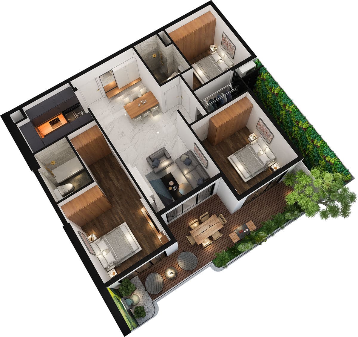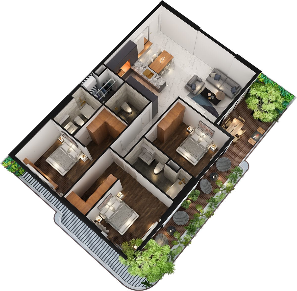| Căn hộ 3 phòng ngủ | 30% | 103m2 | |