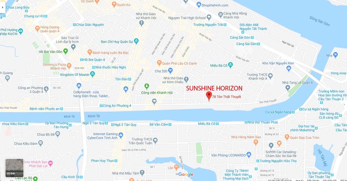 Vị trí Dự án Sunshine Horizon tọa lạc ngay trên Mặt tiền 78 Tôn Thất Thuyết, Phường 16, Quận 4, Tp Hồ Chí Minh. Dự án nằm ngay bên Dòng Kênh Tẻ chạy thẳng ra Sông Sài Gòn, chính vì thế mà Sunshine Horizon Tôn Thất Thuyết sở hữu 1 không gian sống xanh mát nhất khu vực. Đồng thời từ dự án, cư dân rất dể dàng di chuyển vào trung tâm Quận 1 thông qua Đường Nguyễn Tất Thành qua cầu Ông Lãnh để vào trung tâm. Di chuyển qua Phú Mỹ Hưng cũng vô cùng thuận tiện khi chúng ta quẹo phải Nguyễn Tất Thành qua cầu Tân Thuận là đến Nguyễn Văn Linh rồi vào Phú Mỹ Hưng chỉ mất chừng 10 phút.