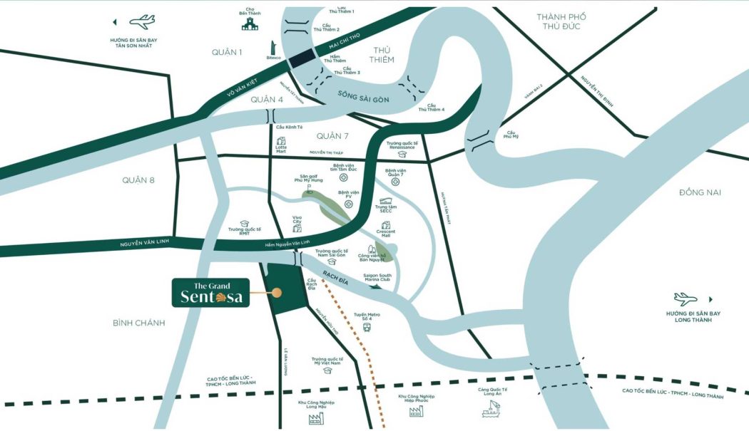 Tiện ích Ngoại khu Dự án The Grand Sentosa liền kề với các tiện ích đẳng cấp Quốc tế của Quận 7 như Trung tâm thương mại SC Vivo, Cresent Mall, Lotte Quận 7, phố đi bộ cầu Ánh Sao, khu đô thị Phú Mỹ Hưng, Bệnh viện FV, trường đại học Quốc tế RMIT, ĐH Tôn Đức Thắng, ĐH Cảnh Sát,..