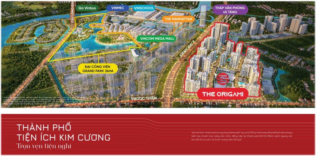 The Origami khu căn hộ gồm 21 block cao 25 – 35 tầng cung ứng hơn 10.000 căn và shophouse tọa lạc vị trí trung tâm Khu đô thị Vinhomes Grand Park, quận 9, TP HCM. Sau sự thành công ngoài sức mong đợi thì phân khu 1 The Rainbow, chủ đầu tư Vingroup chính thức công bố phân khu căn hộ thứ 2 The Origami. Đây là sự kết hợp giữa Vingroup và 2 đối tác uy tín đến từ Nhật Bản là Tập đoàn Mitsubishi và Nomura. Với mục tiêu quy hoạch, The Origami Vinhomes Quận 9 sẽ trở thành phân khu đẹp nhất đại đô thị Vinhomes Grand Park được thiết kế cao cấp theo phong cách đặc trưng của xứ sở hoa Anh Đào. Dự án được kỳ vọng nối dài sứ mệnh thay đổi bộ mặt khu Đông Sài Gòn bằng những giá trị sống khác biệt.